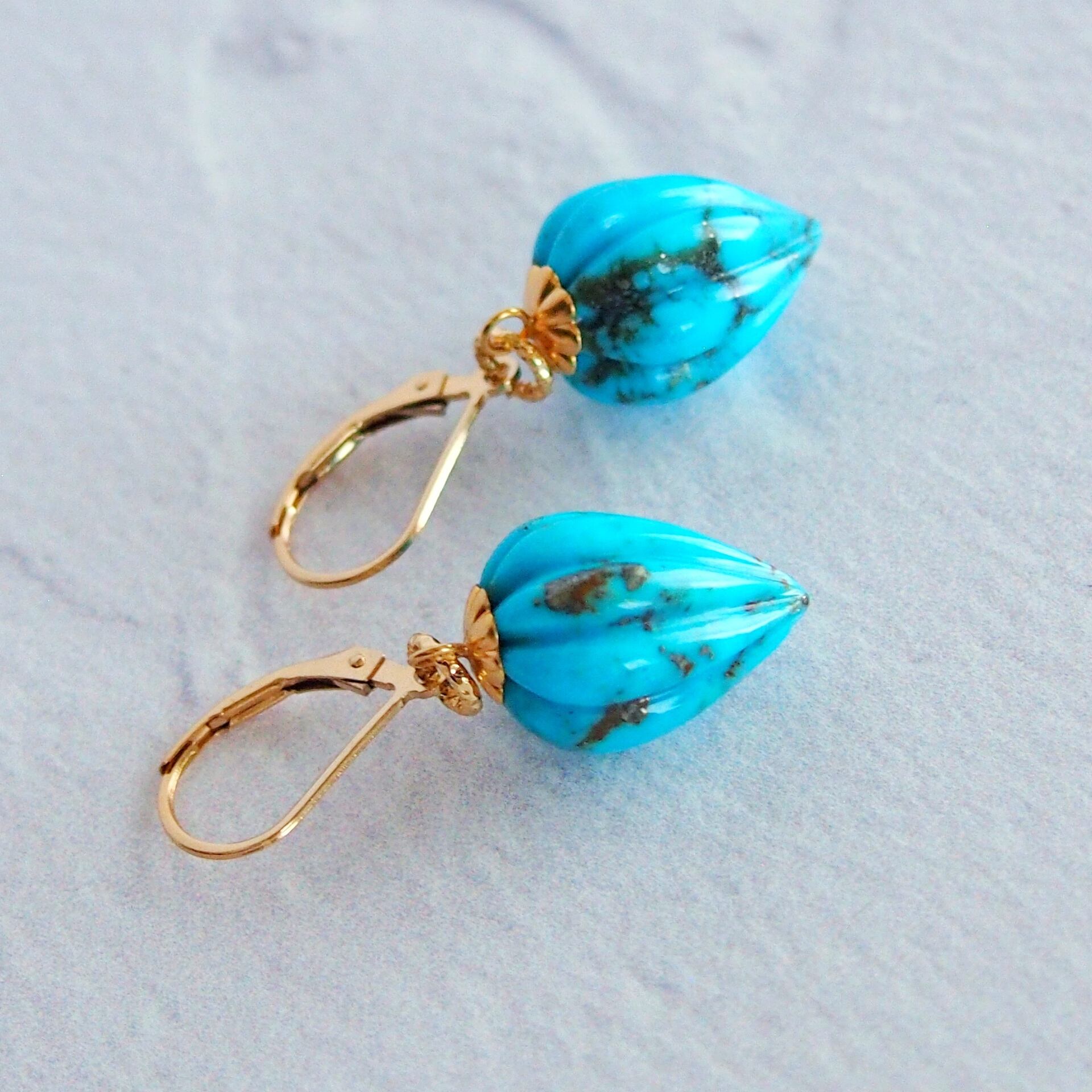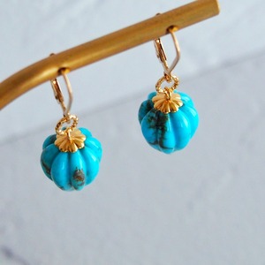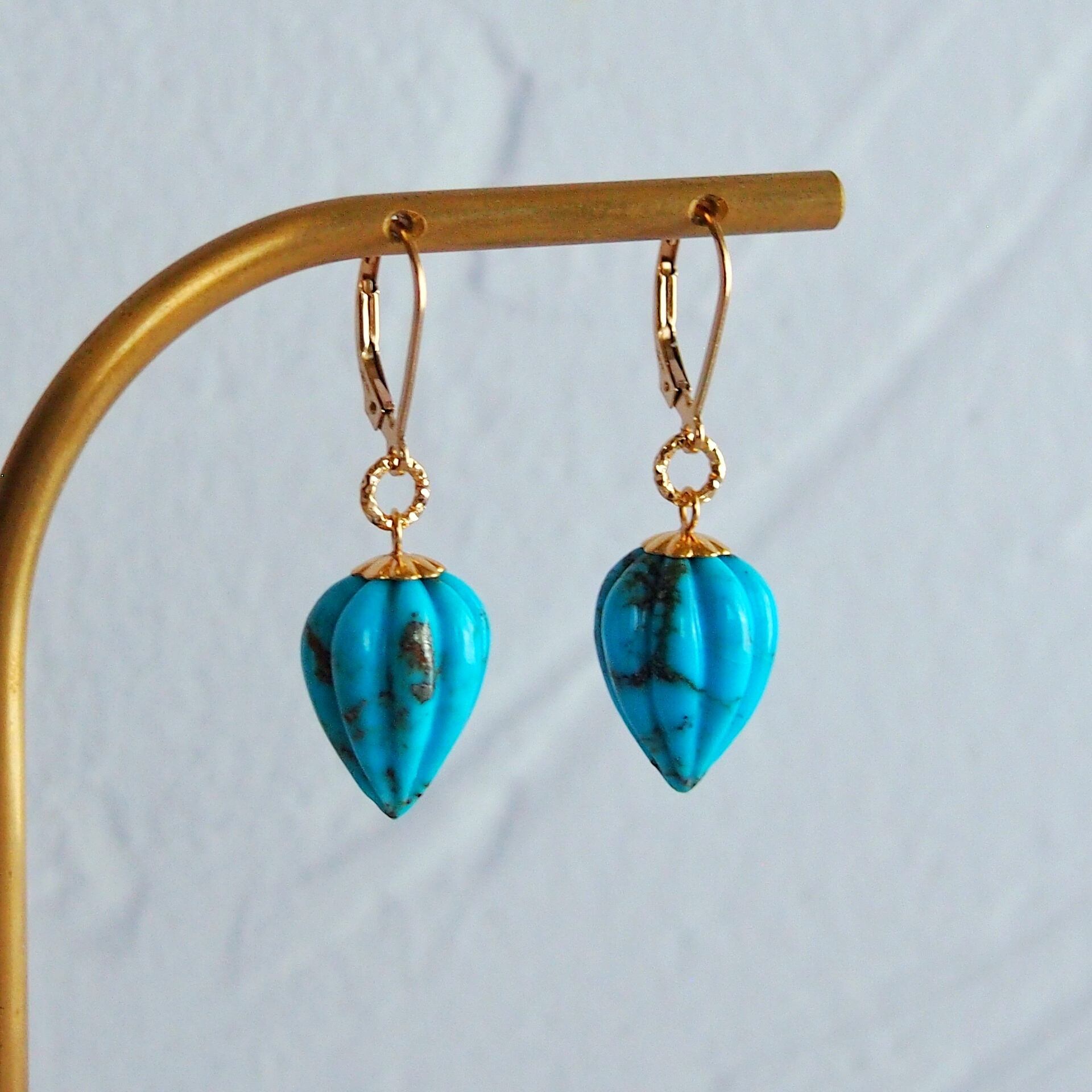 大粒ターコイズ ドロップカービングピアス 14kgf