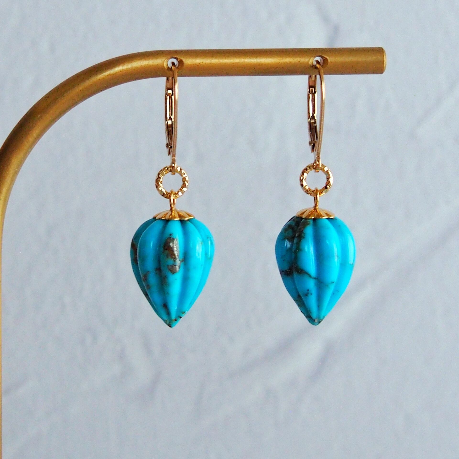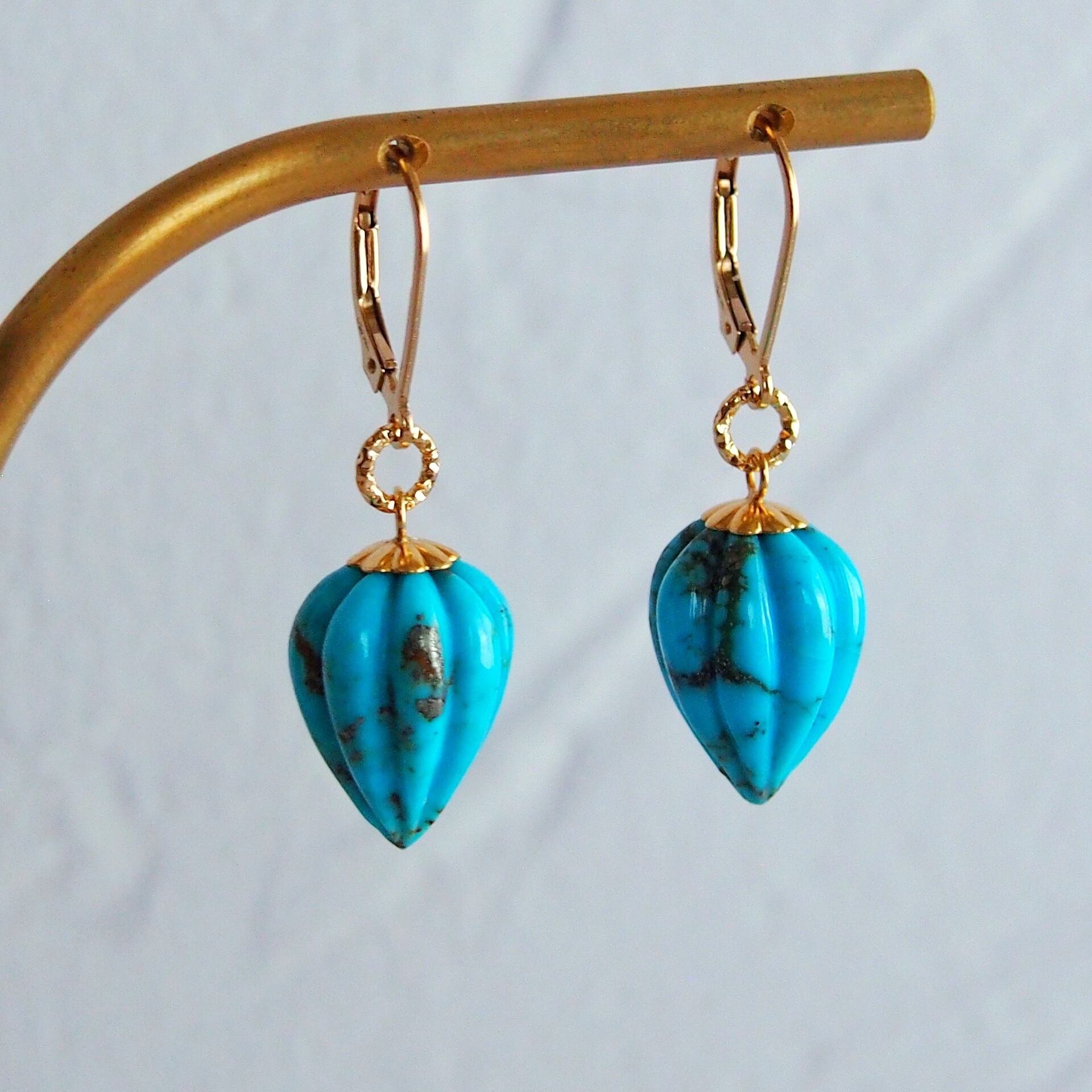 インドの職人の手仕事によって、一石一石丁寧なカービングが施された美しいターコイズには、フリルの様な可愛らしいキャップ型のヒートンが付いており、細部まで作り手のデザインへのこだわりが感じられ、特別な存在感を纏っています。