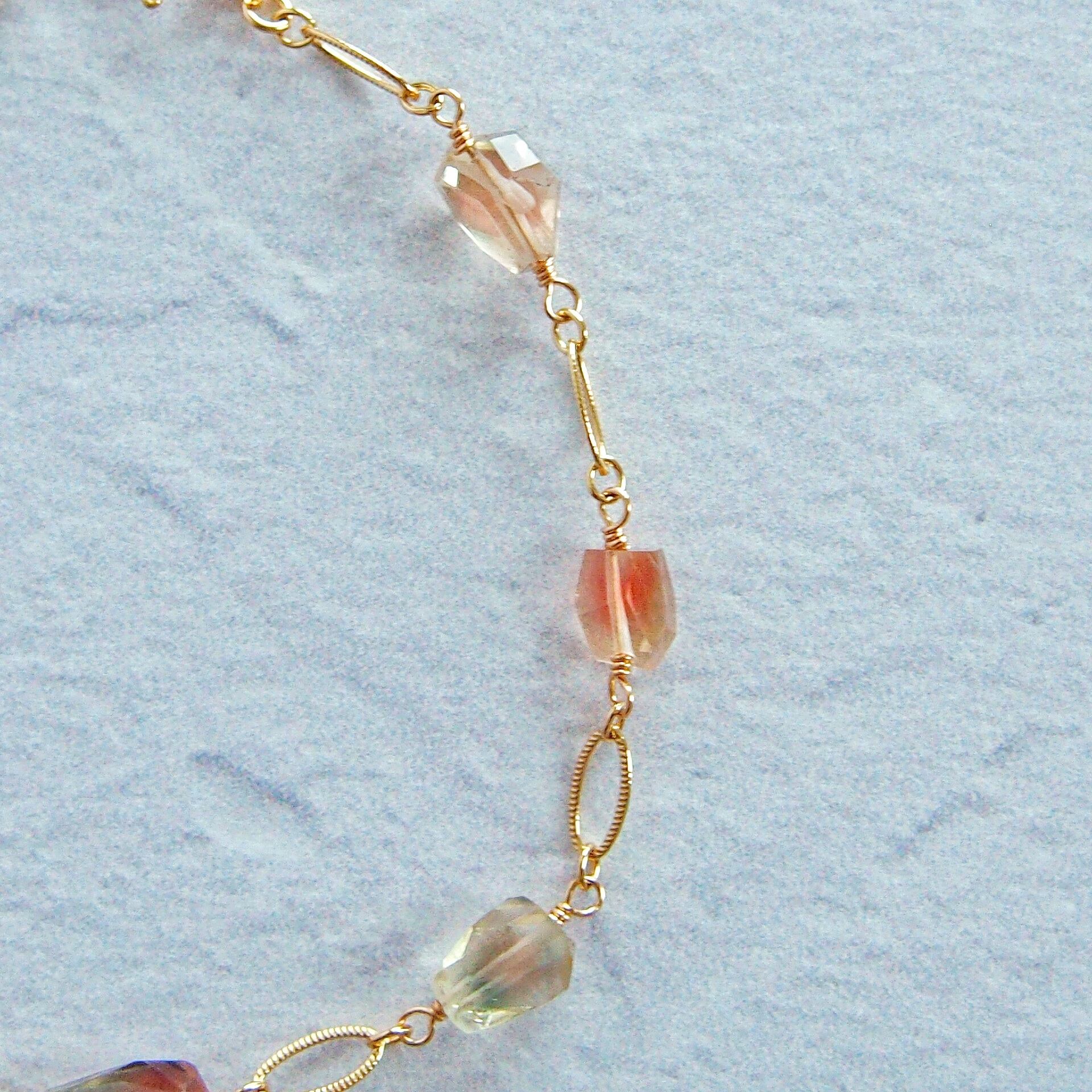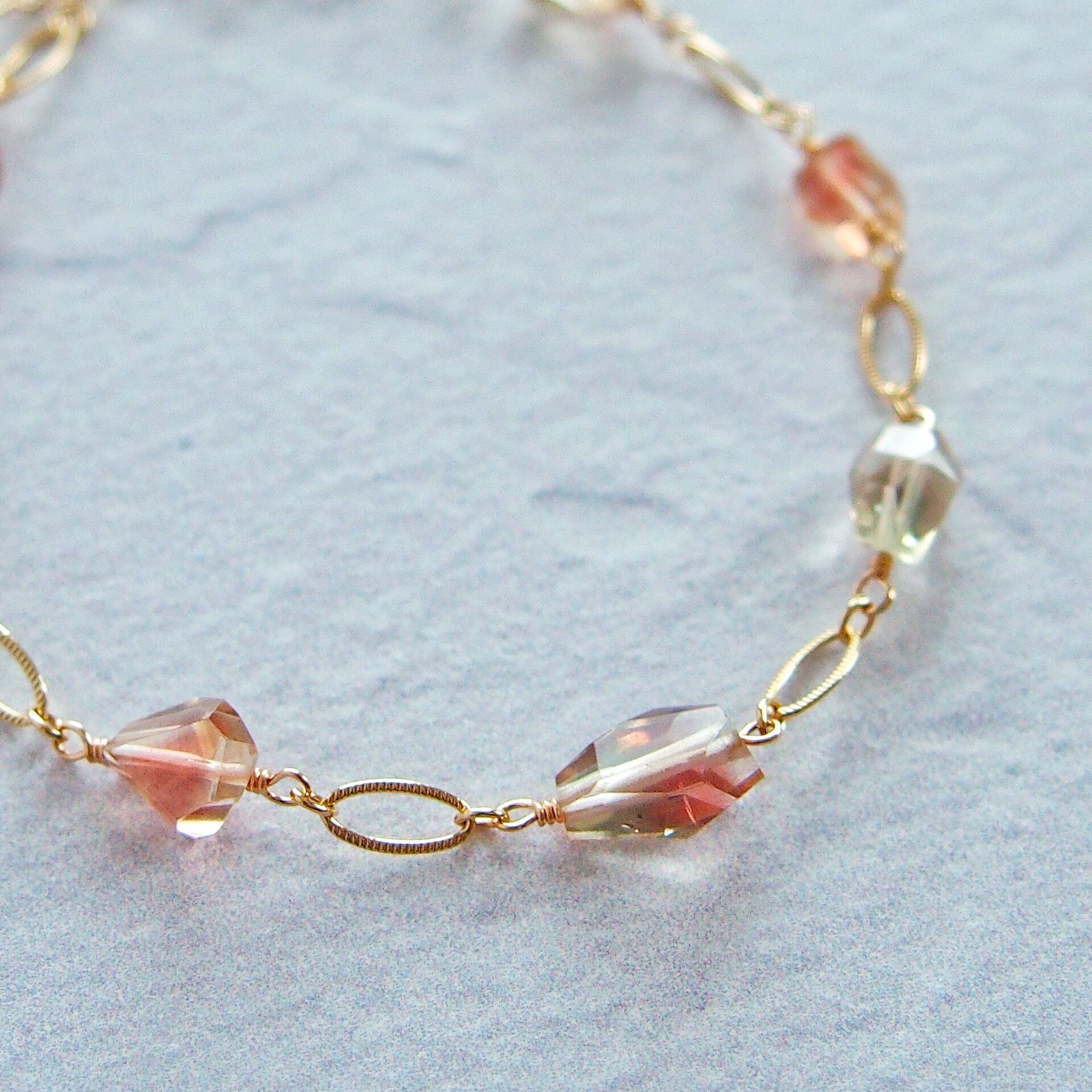 様々なお色味が楽しめるオレゴンサンストーンの魅力が詰まった特別感のあるブレスレットで、貴重なバイカラーや美しいピンクシラーの石が含まれています。
