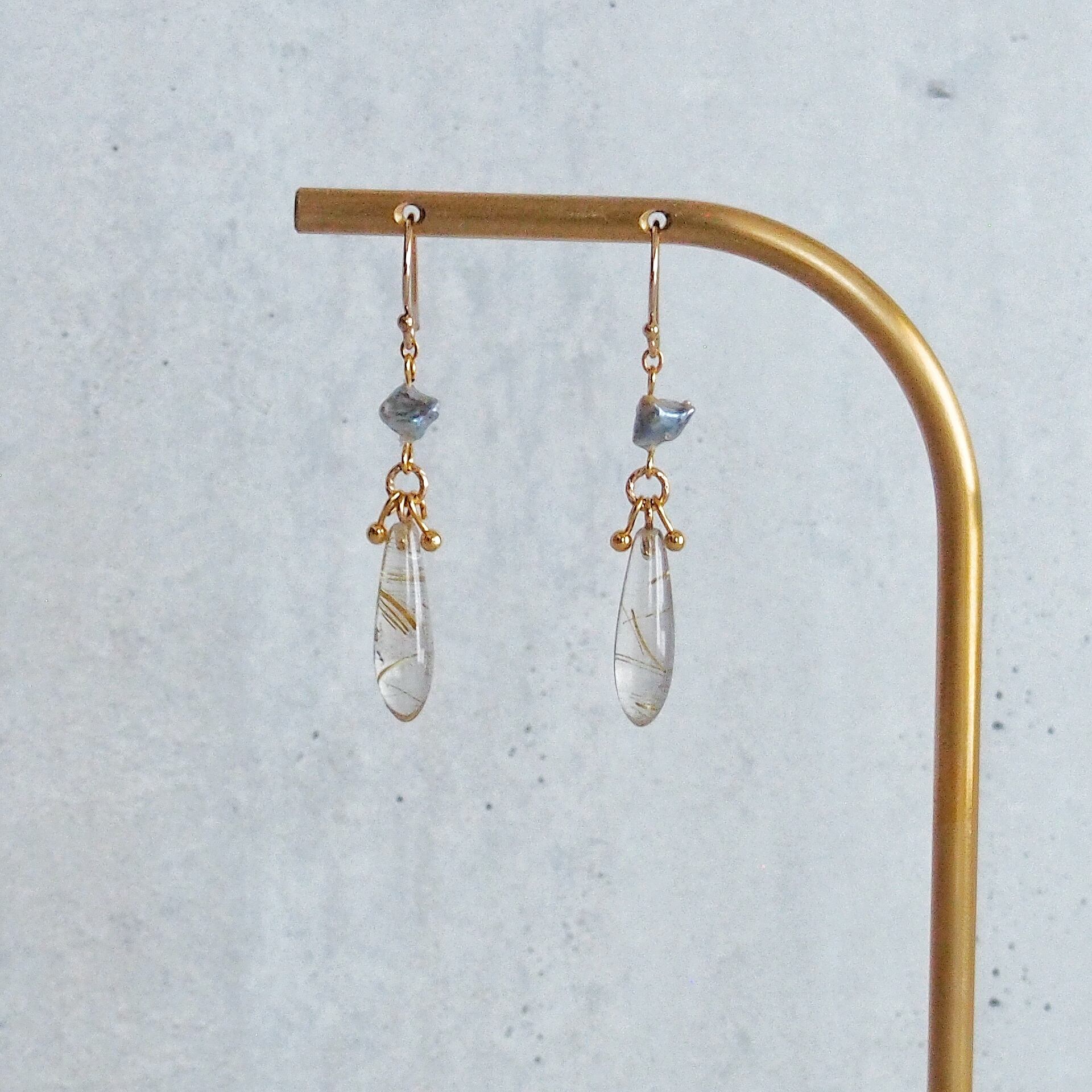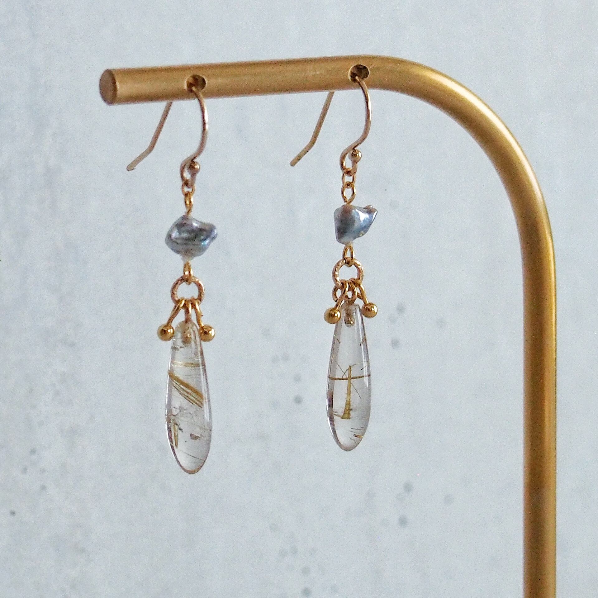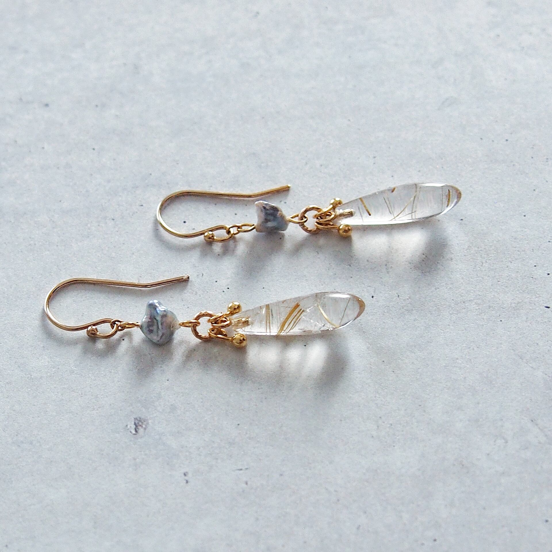 美しいゴールドカラーの針が印象的なルチルクオーツのピアス。