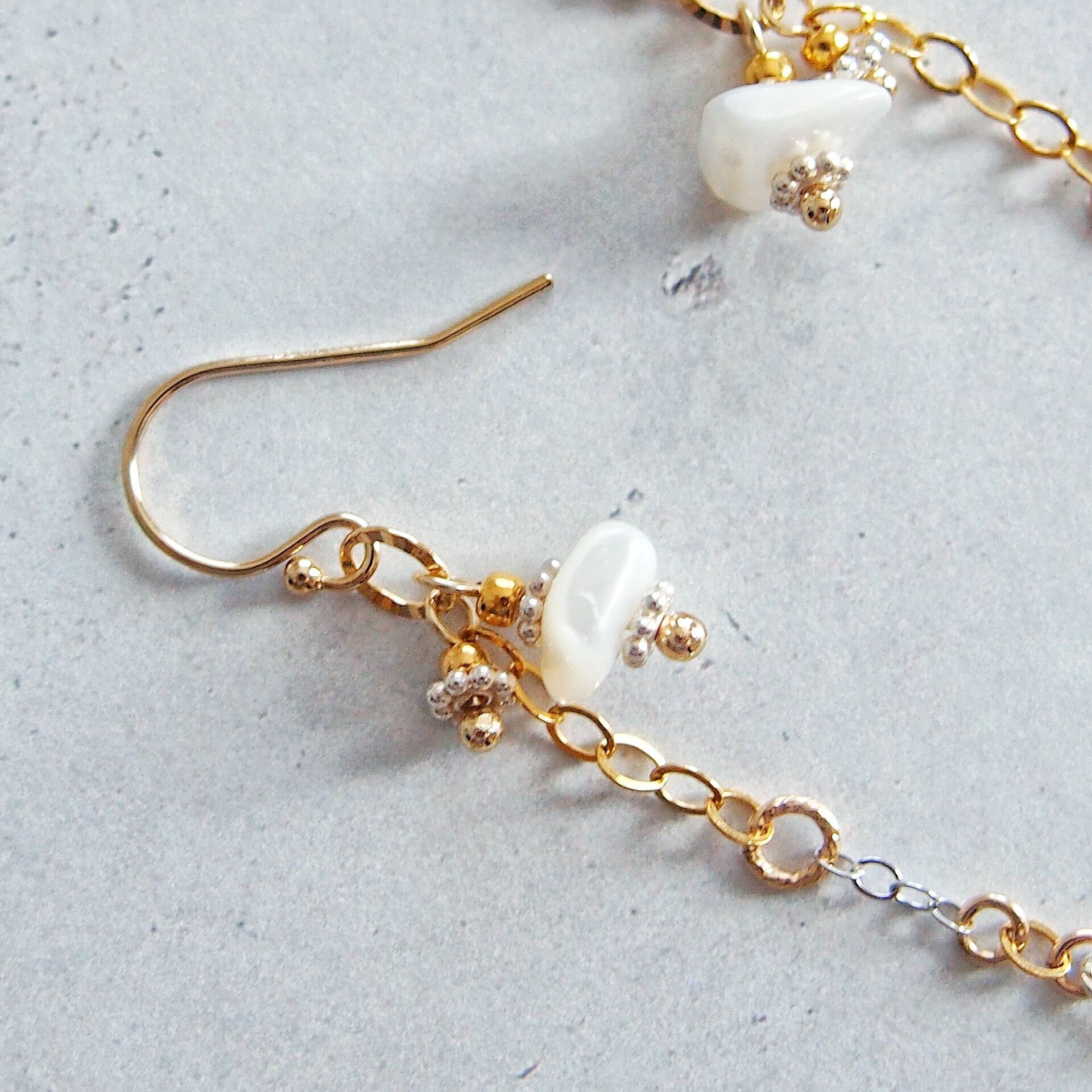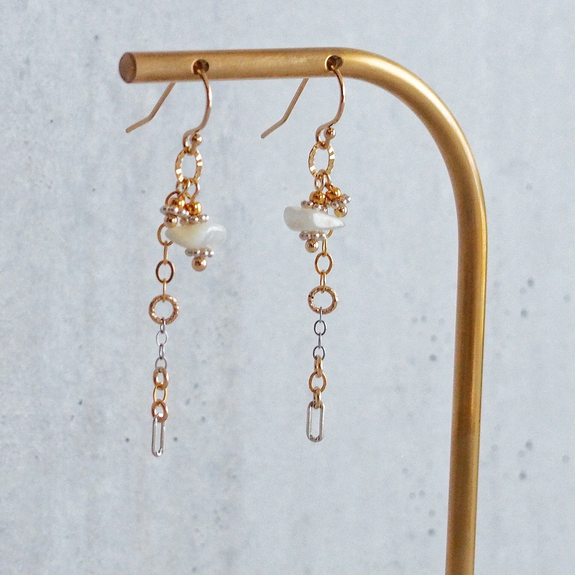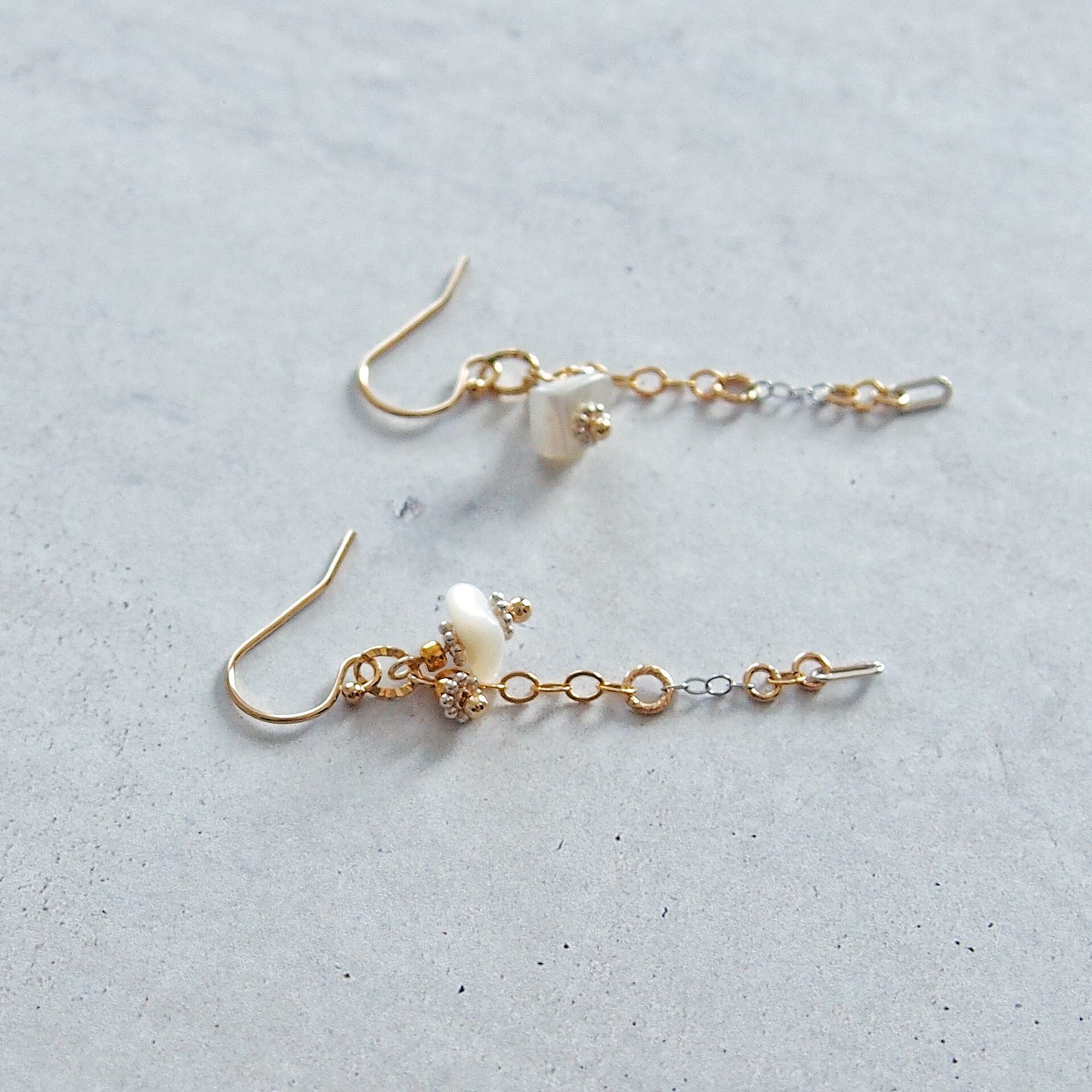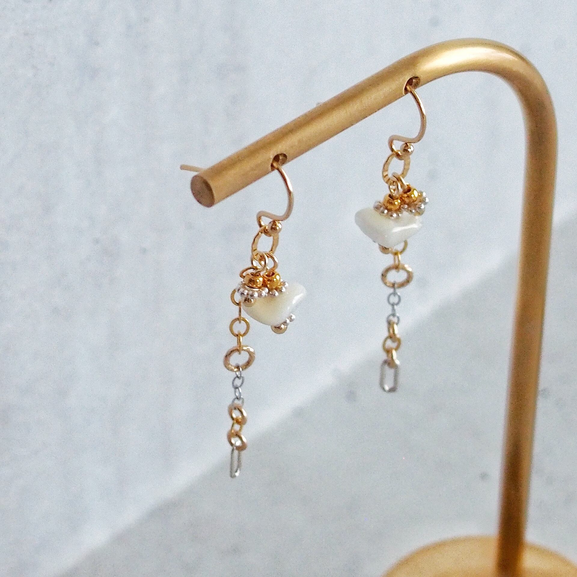 ホワイトカラーが涼しげなマザーオブパールを主役にしたデザインのピアス。