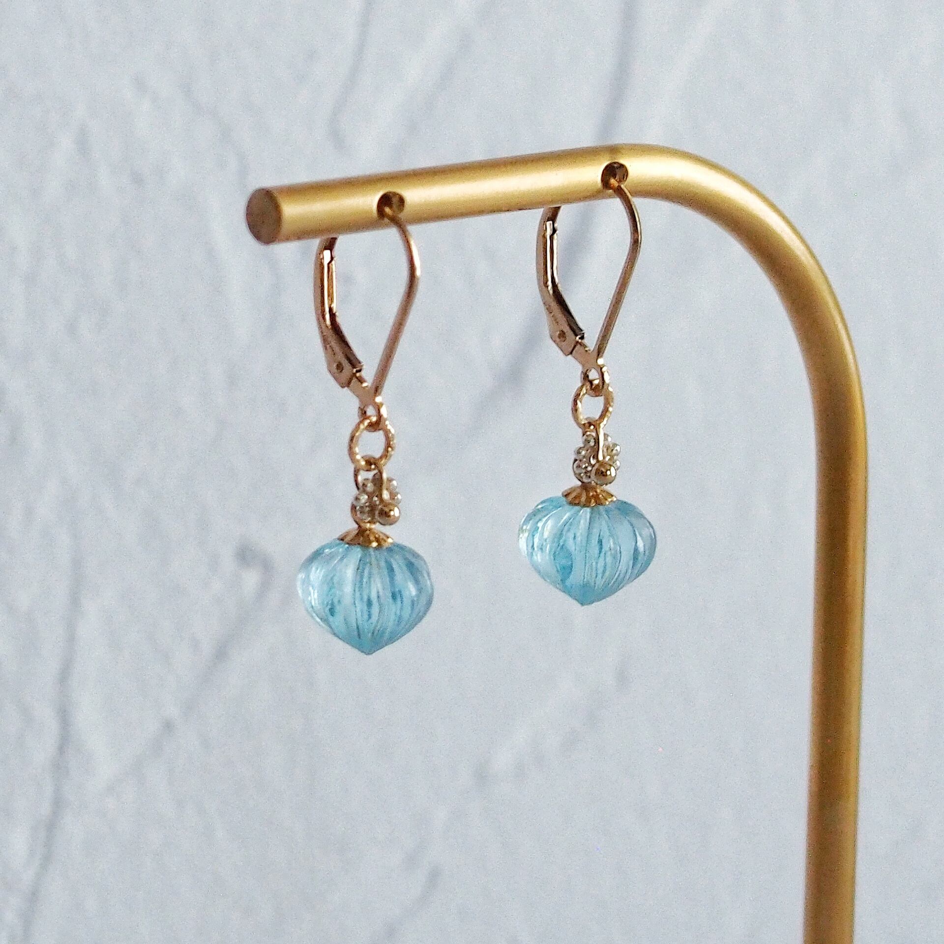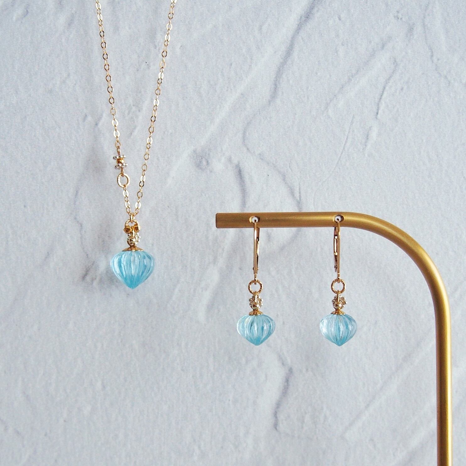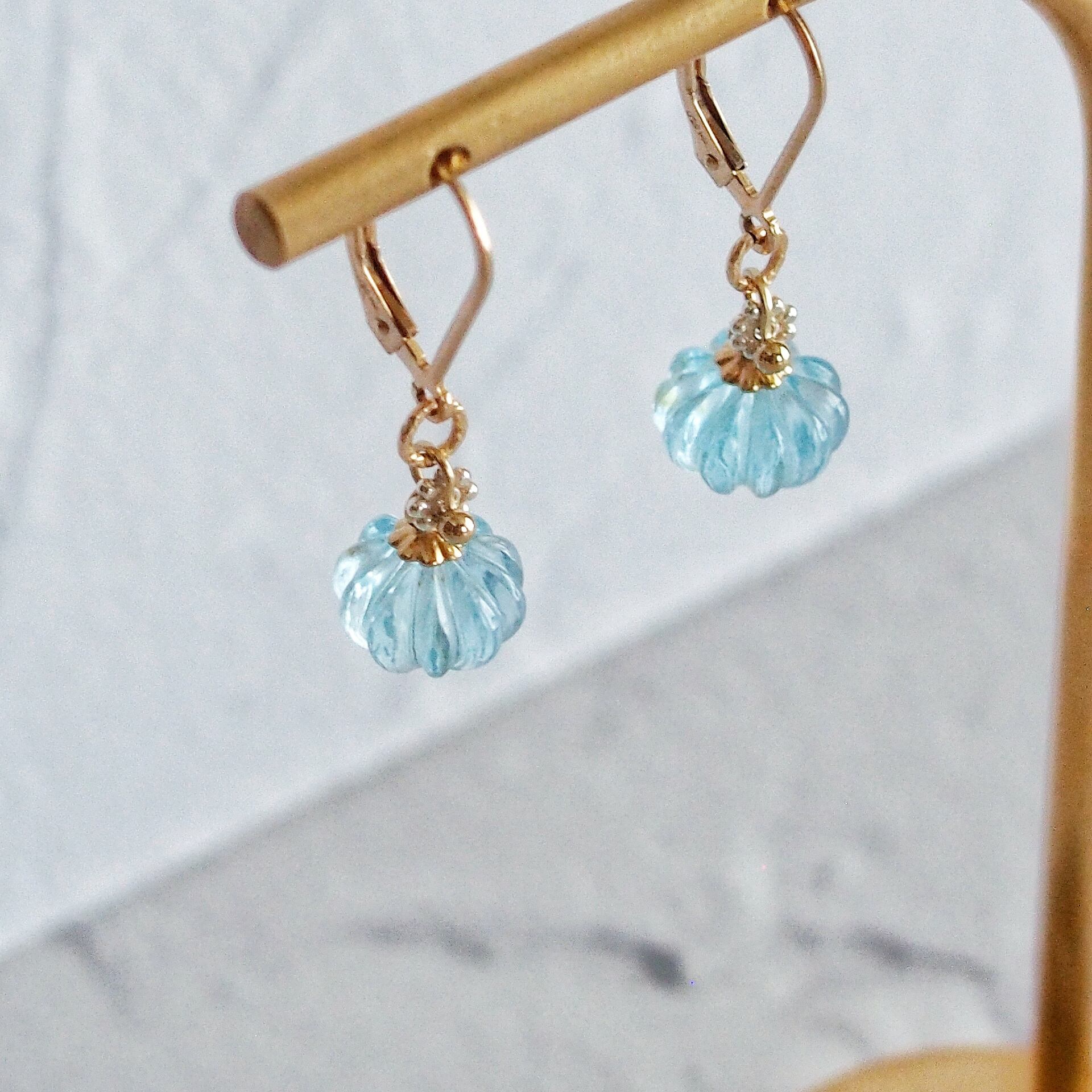 インドの職人の手仕事によって一石一石丁寧なカービングが施された美しいブルートパーズは、可愛らしいキャップ型のヒートンが付いており、細部までデザインへのこだわりが感じられ、上質な存在感を纏っています。