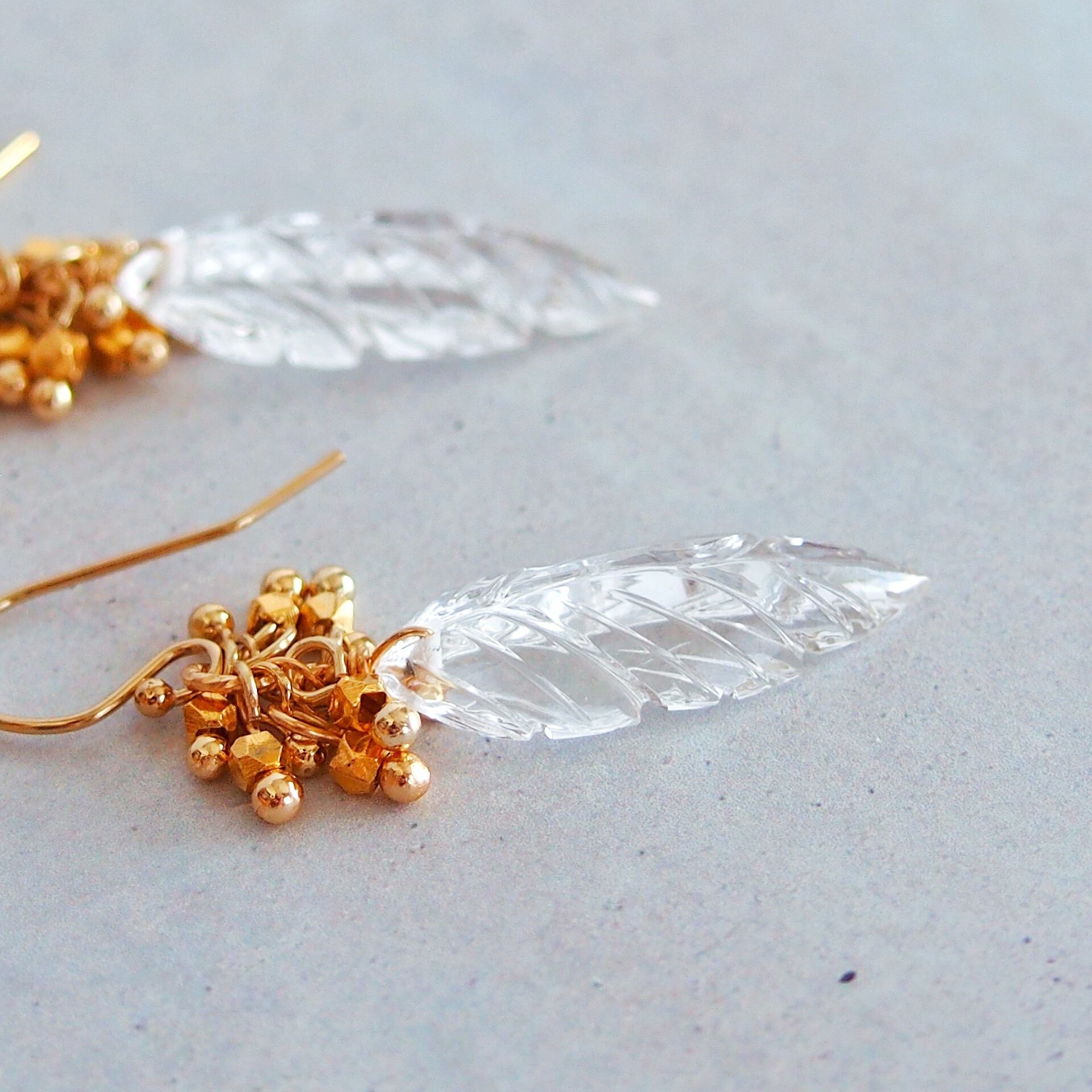 インドの職人の手仕事によって、一石一石丁寧に作られたリーフのデザインが美しいクリスタルクォーツには、表面にカットが施された24kヴェルメイユビーズと14kgfを組み合わせたメタルモチーフをあしらいました。
