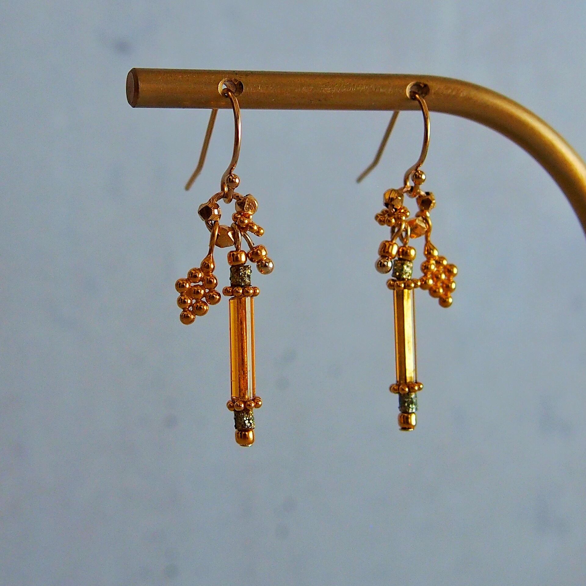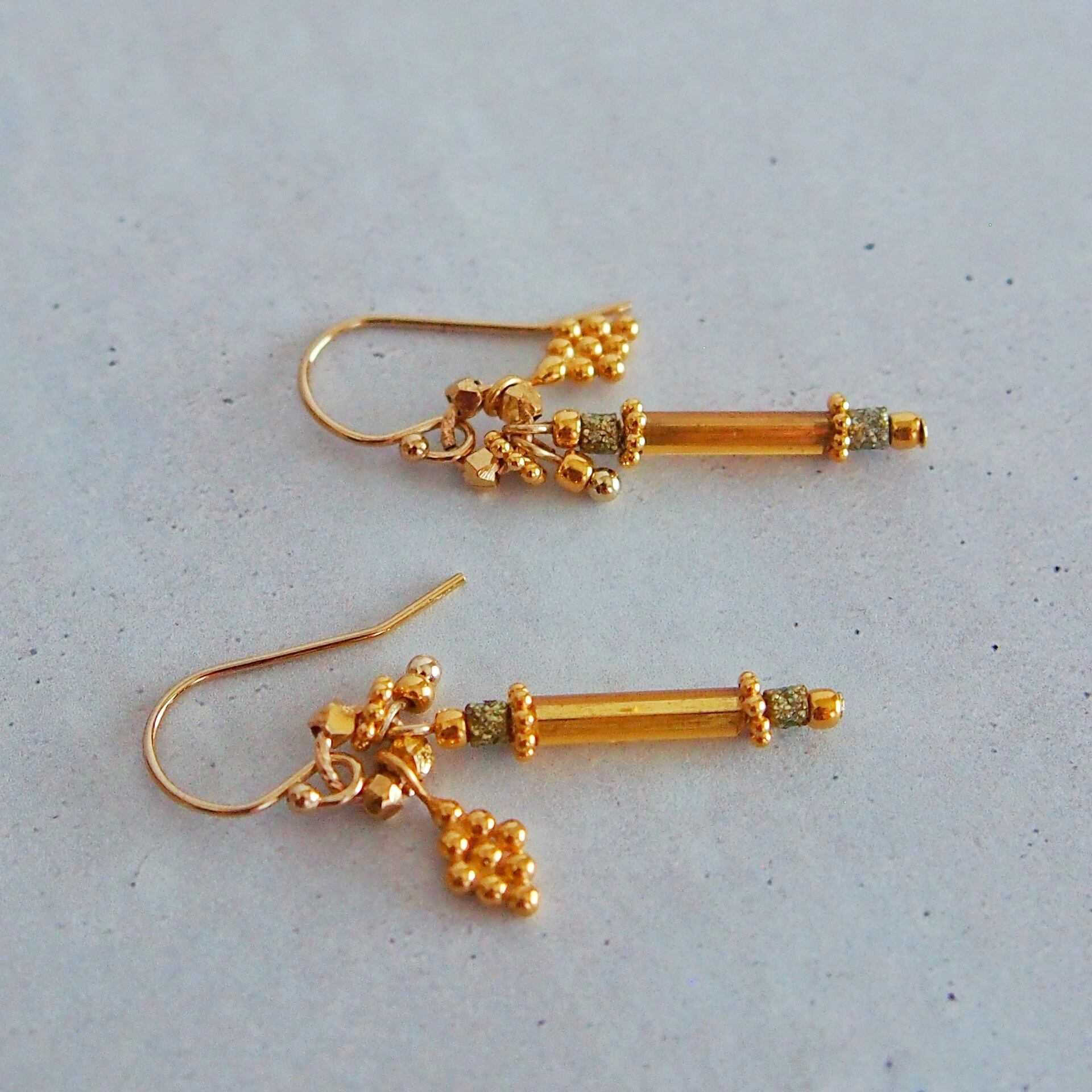細長いゴールドのビーズはガラス製で、1920~30年代に製造されたフランスヴィンテージ、上下のグリーンがかったゴールドのビーズはゼラチン製で、1800年代のフランスアンティークビーズです。