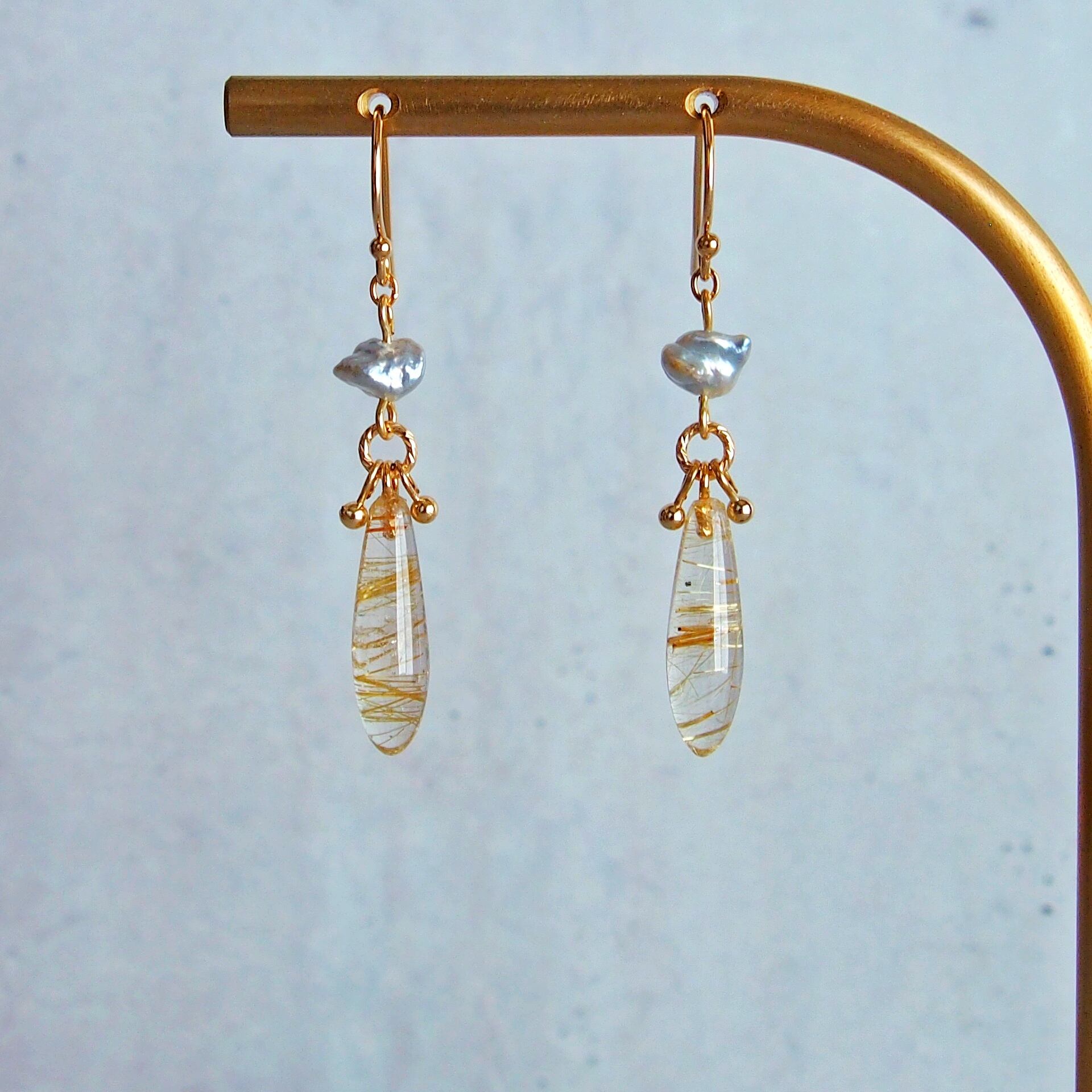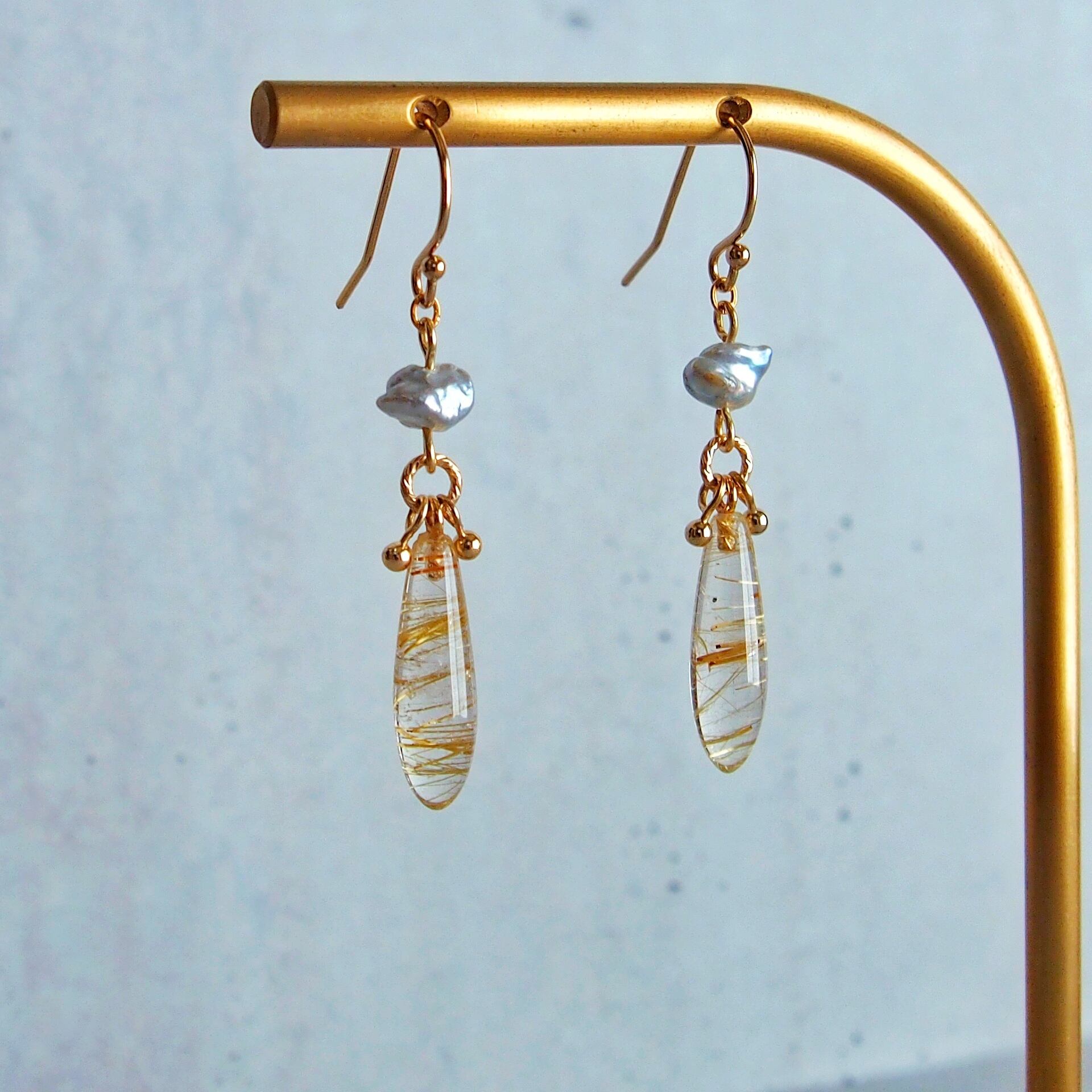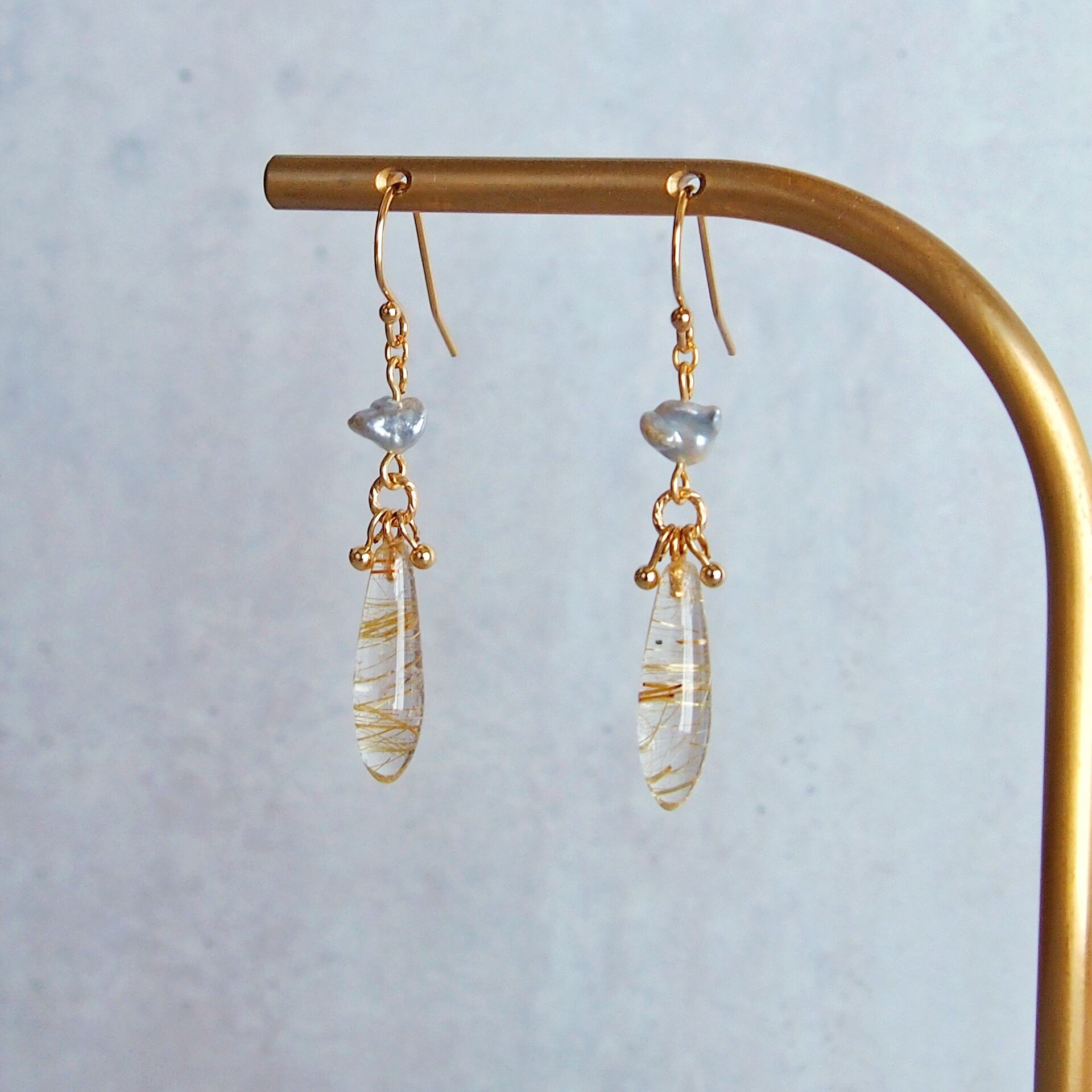 ルチルクォーツ×あこやケシパール ロングドロップ ピアス
