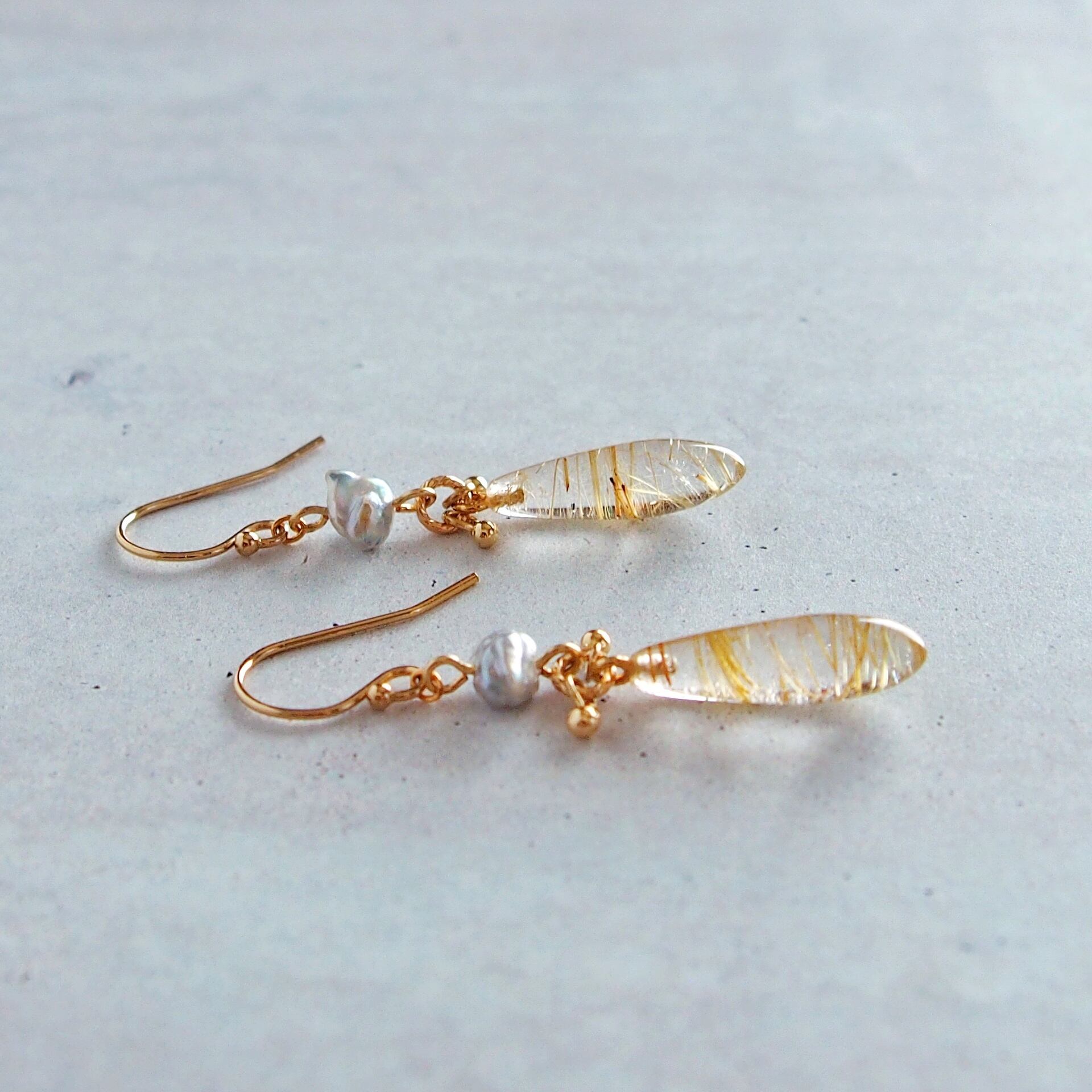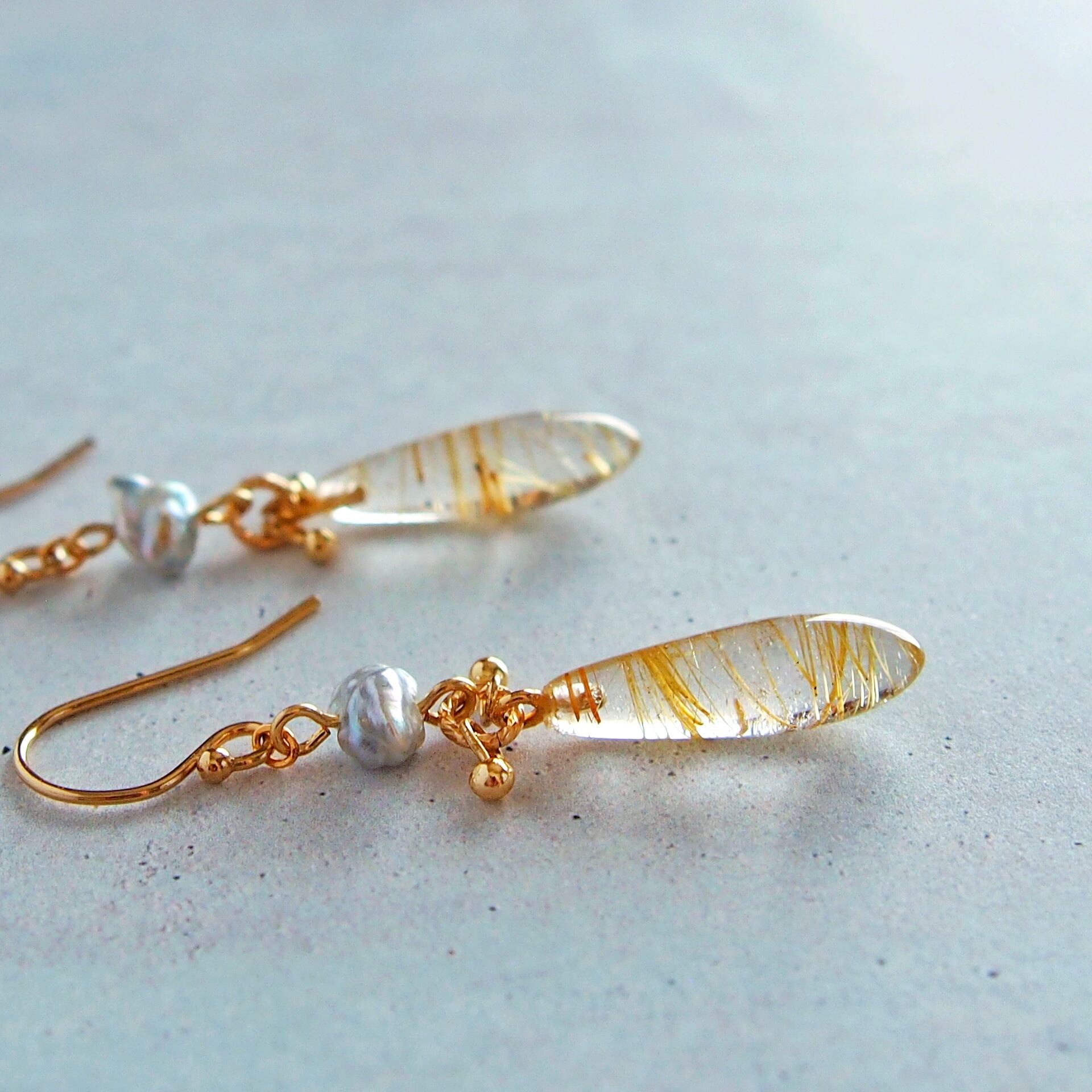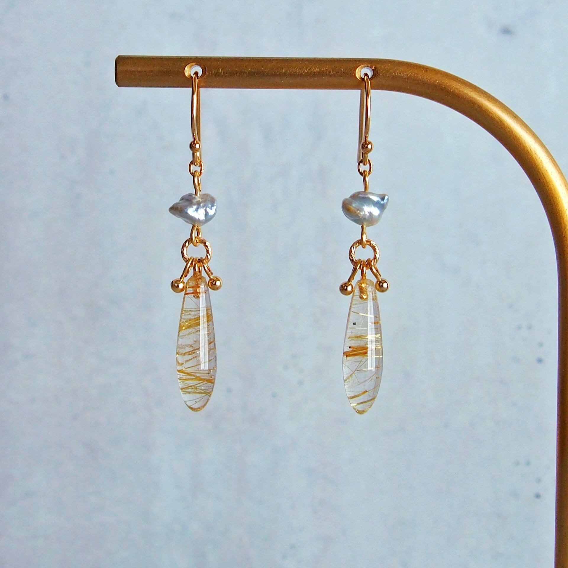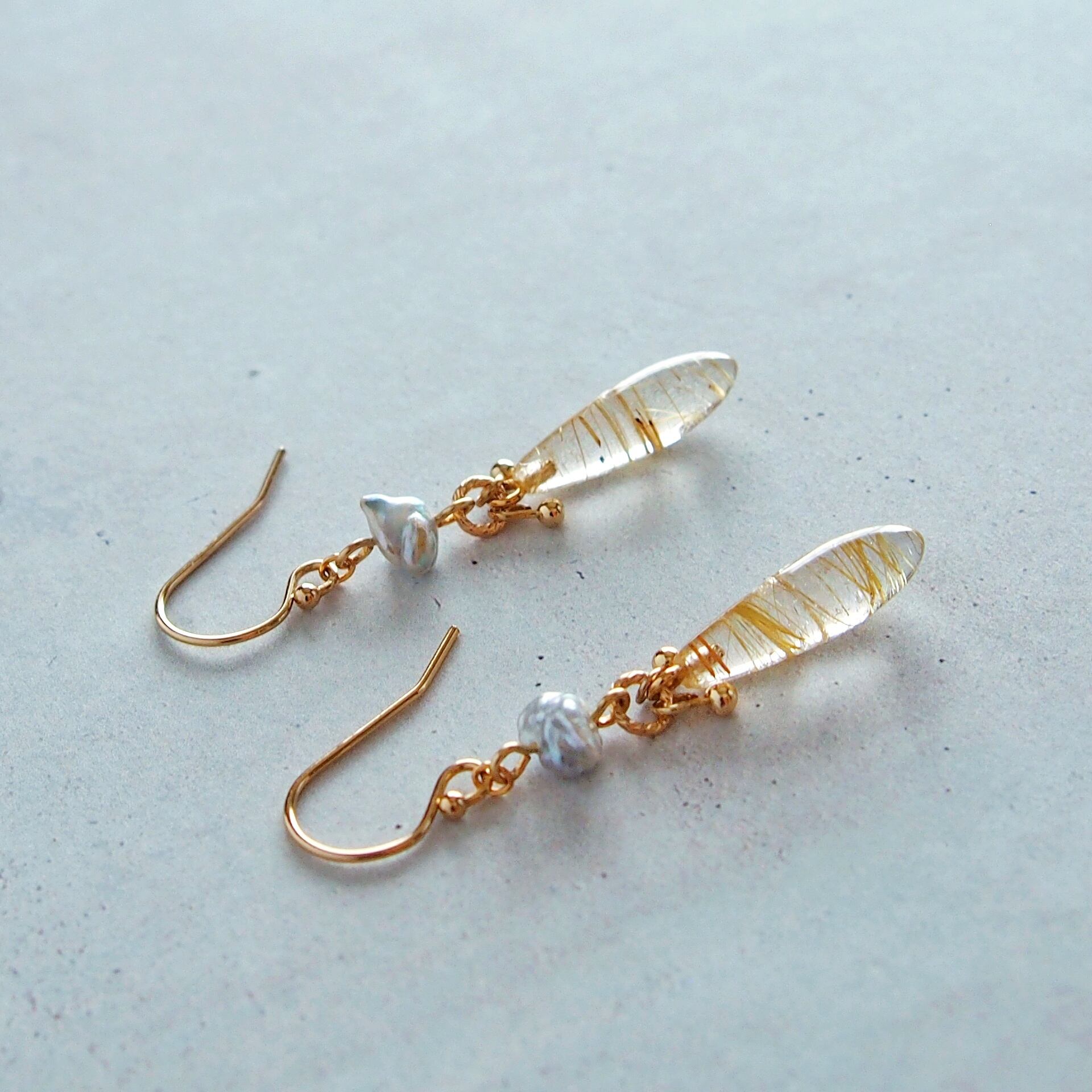 ルチルクォーツ×あこやケシパール ロングドロップ ピアス