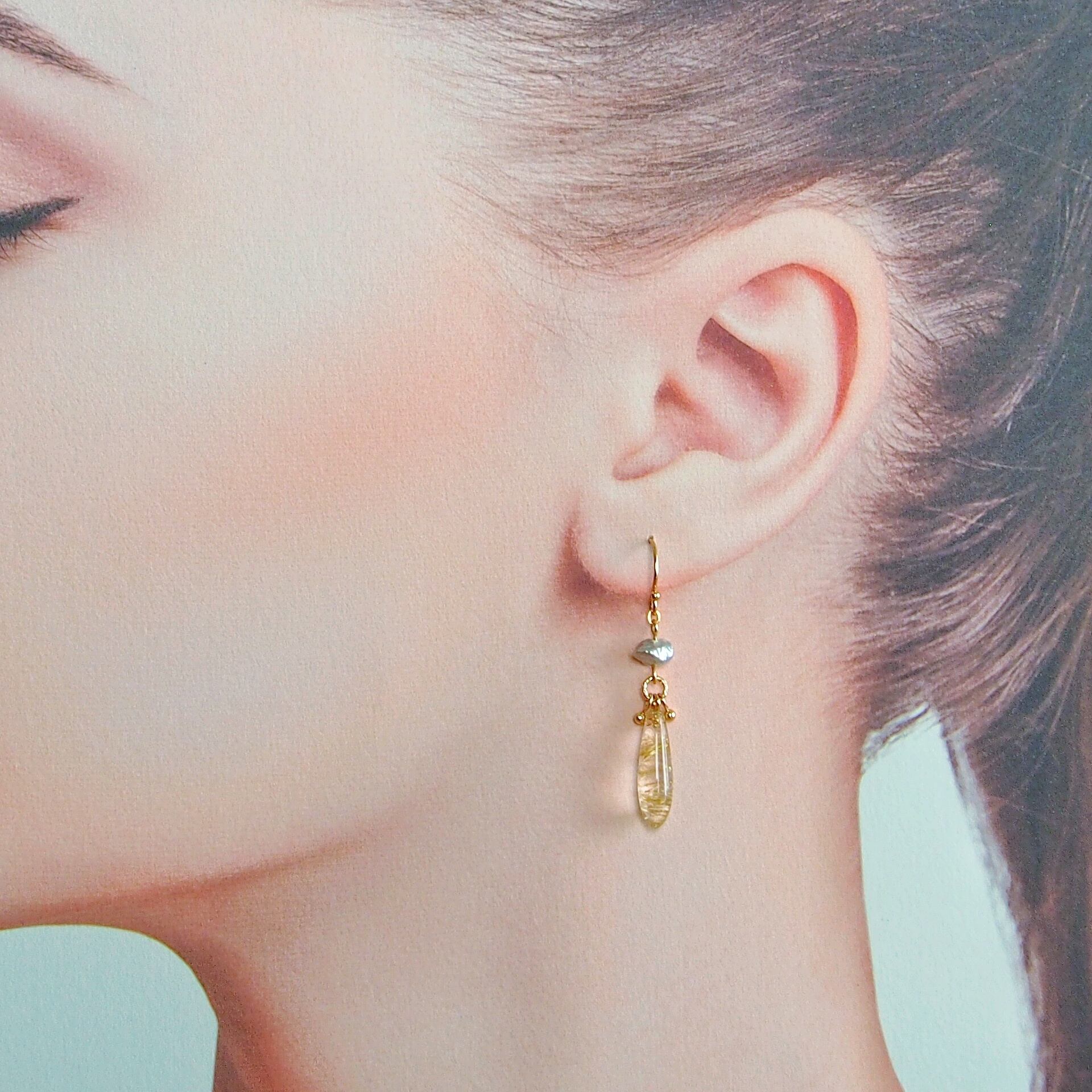 美しいゴールドカラーの針が印象的なルチルクオーツのピアス。