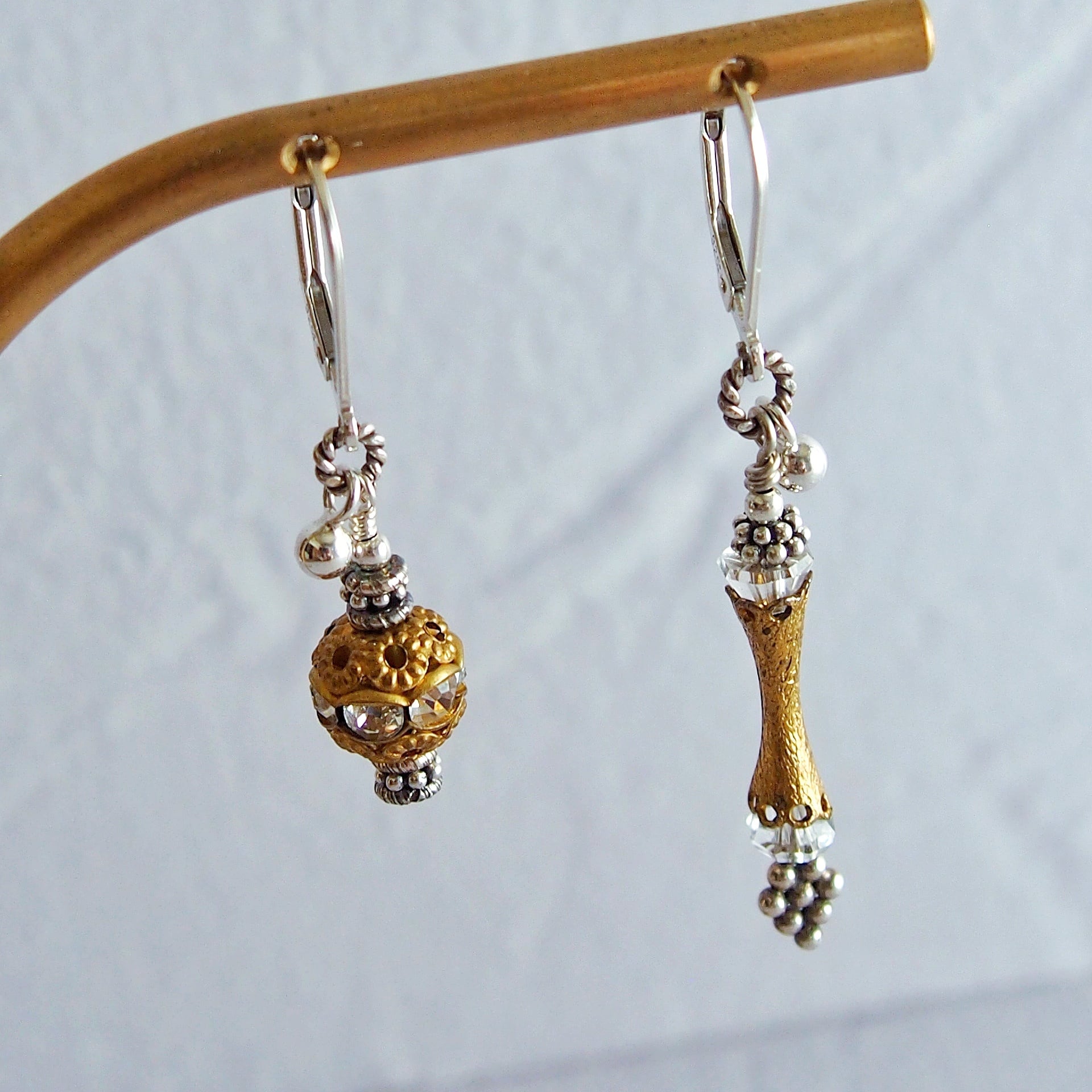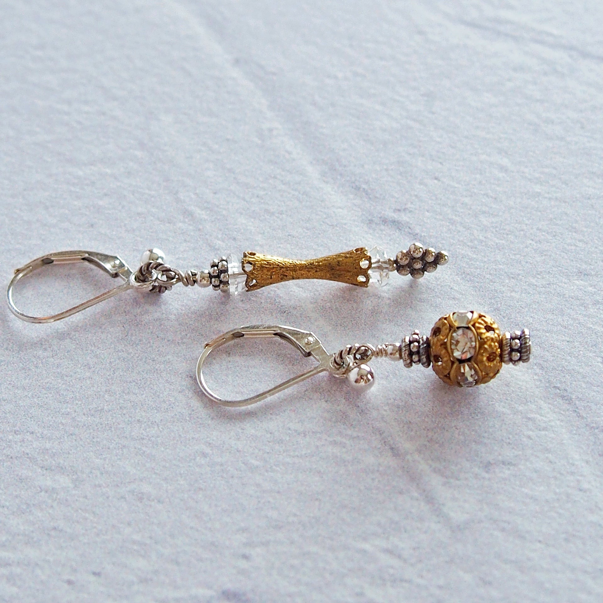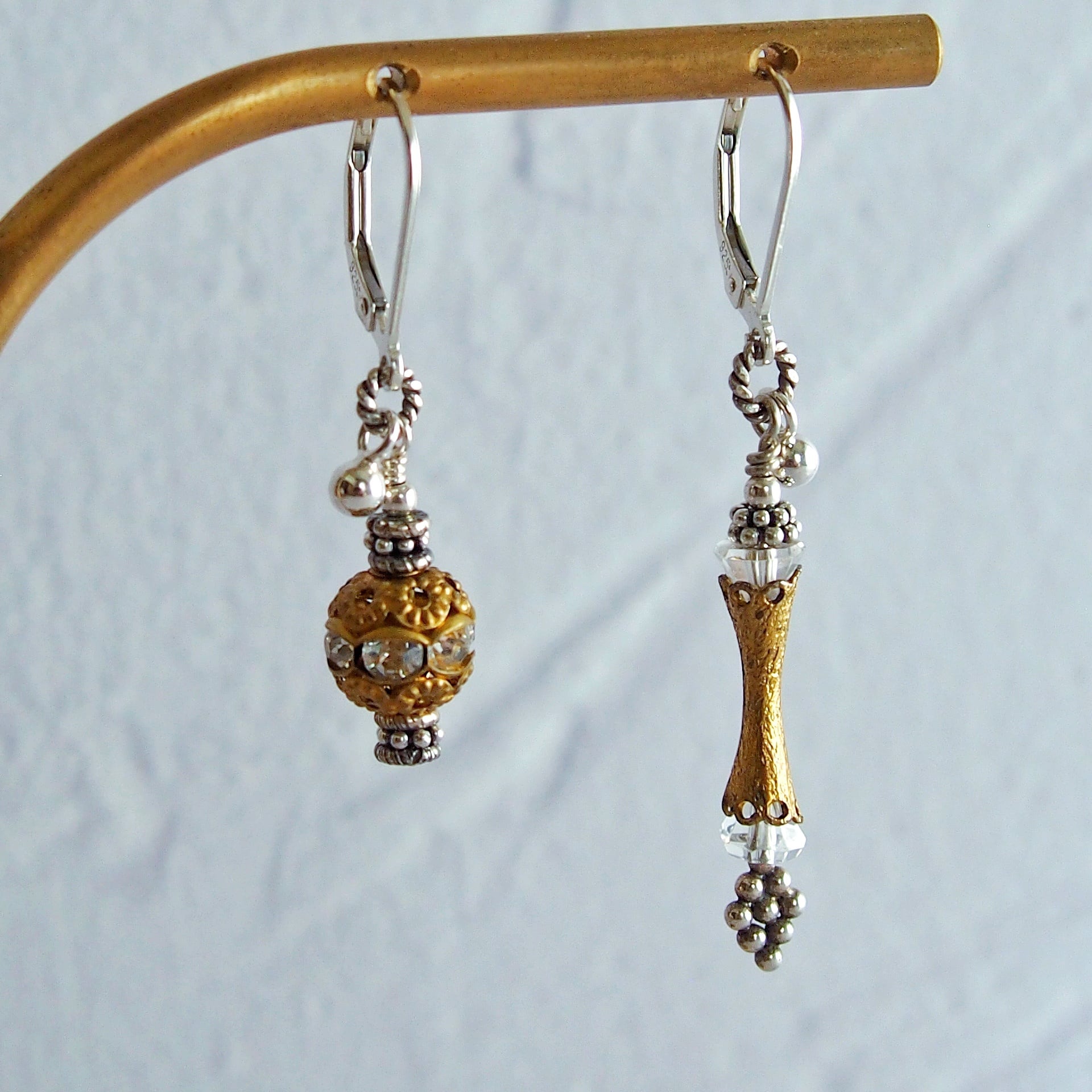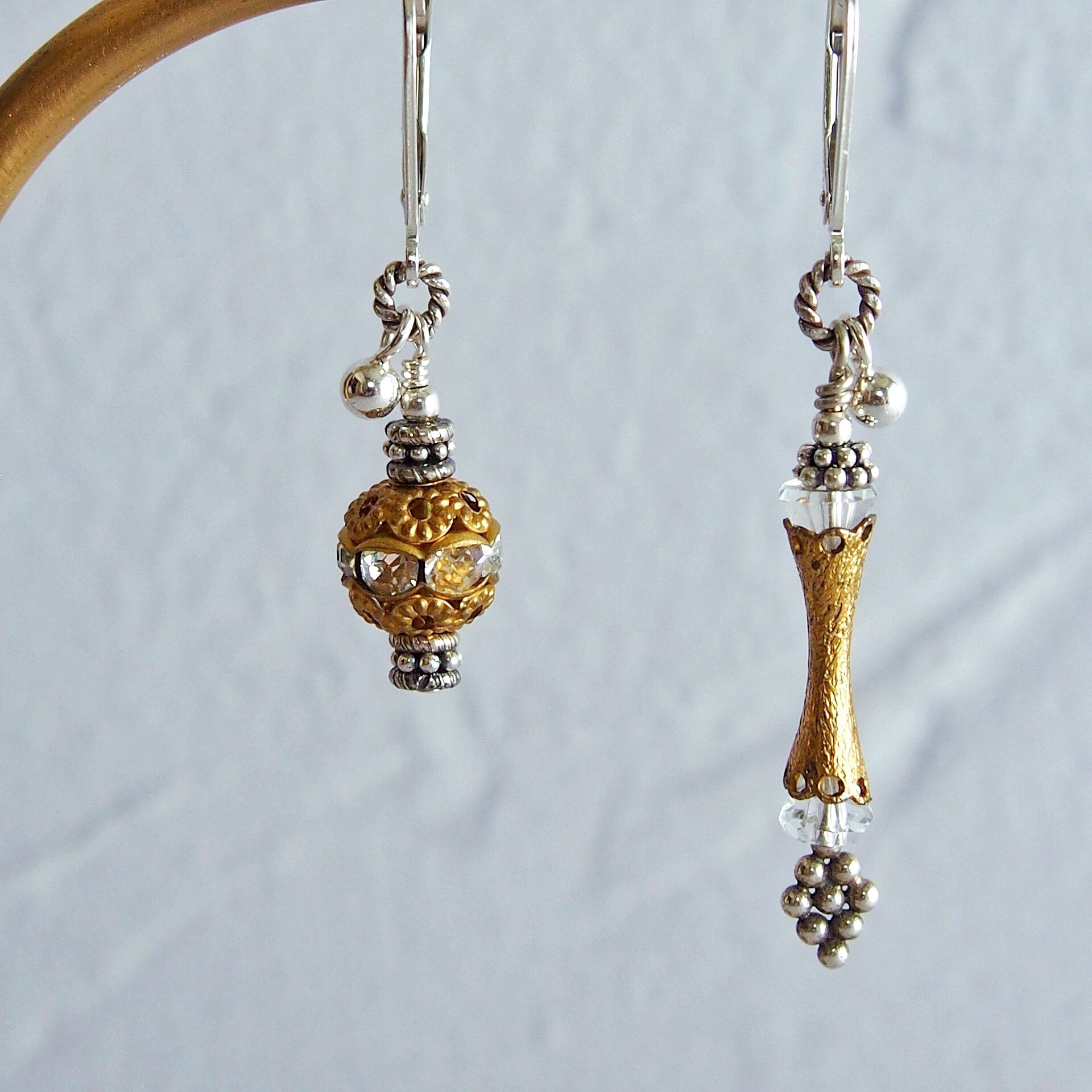 ヴィンテージメタルビーズと水晶を組み合わせたアシンメトリーのピアス。